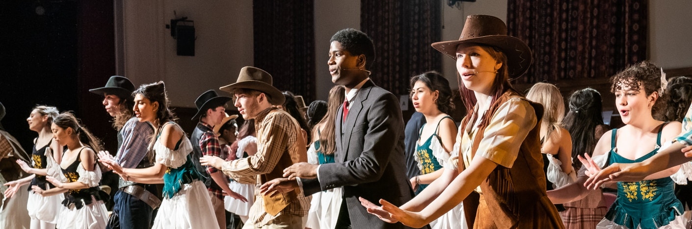 As ever, Director Ms Elie Middleton,had done a superb job with the ensemble. Every member of the cast was fully engaged at all times. The Deadrock cowboys, especially, gave us a range of neatly characterised performances. The girls are less well served, as characters, but they made up for this with their dancing. The split staging, which employed almost the whole length of the Great Hall’s floor for Deadrock, worked well; the intimacy made it easy for the audience to share in the fun.
